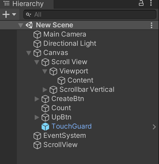 ScrollView 오브젝트에 ScrollView 스크립트를 넣어서 작성했습니다.