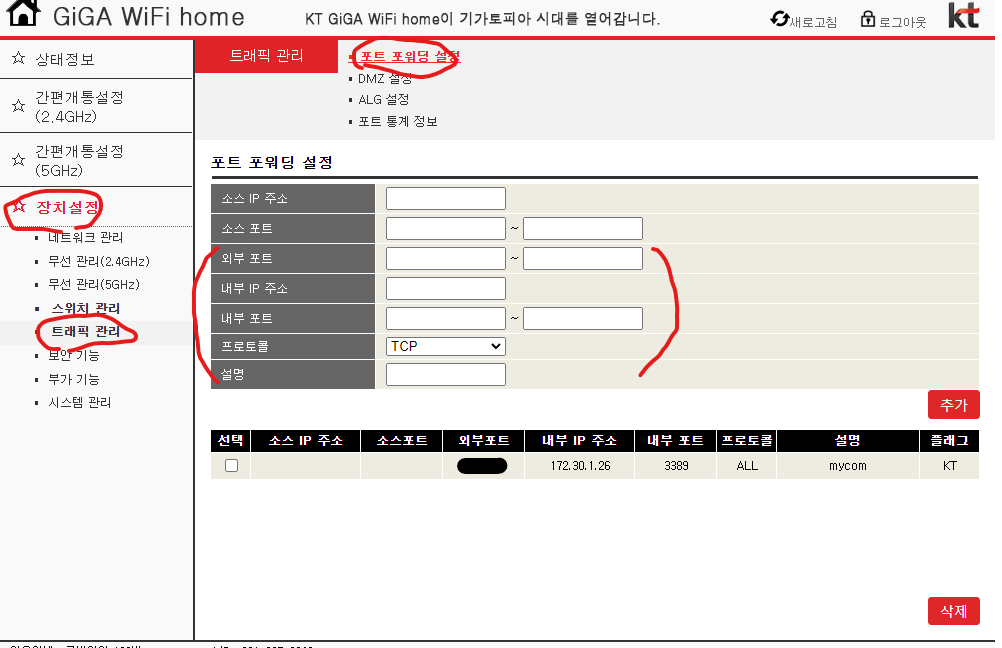 이제 장치설정 → 트래픽 관리 → 포트 포워딩 설정을 클릭하시면 다음처럼 나타납니다.