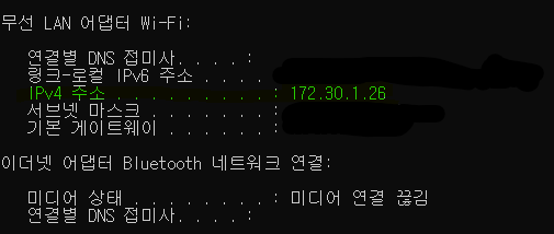 * 내부 IP 주소 : 접근하고자 하는 IP주소 (ipconfig로 알아낸 ip주소를 입력하시면 됩니다.)