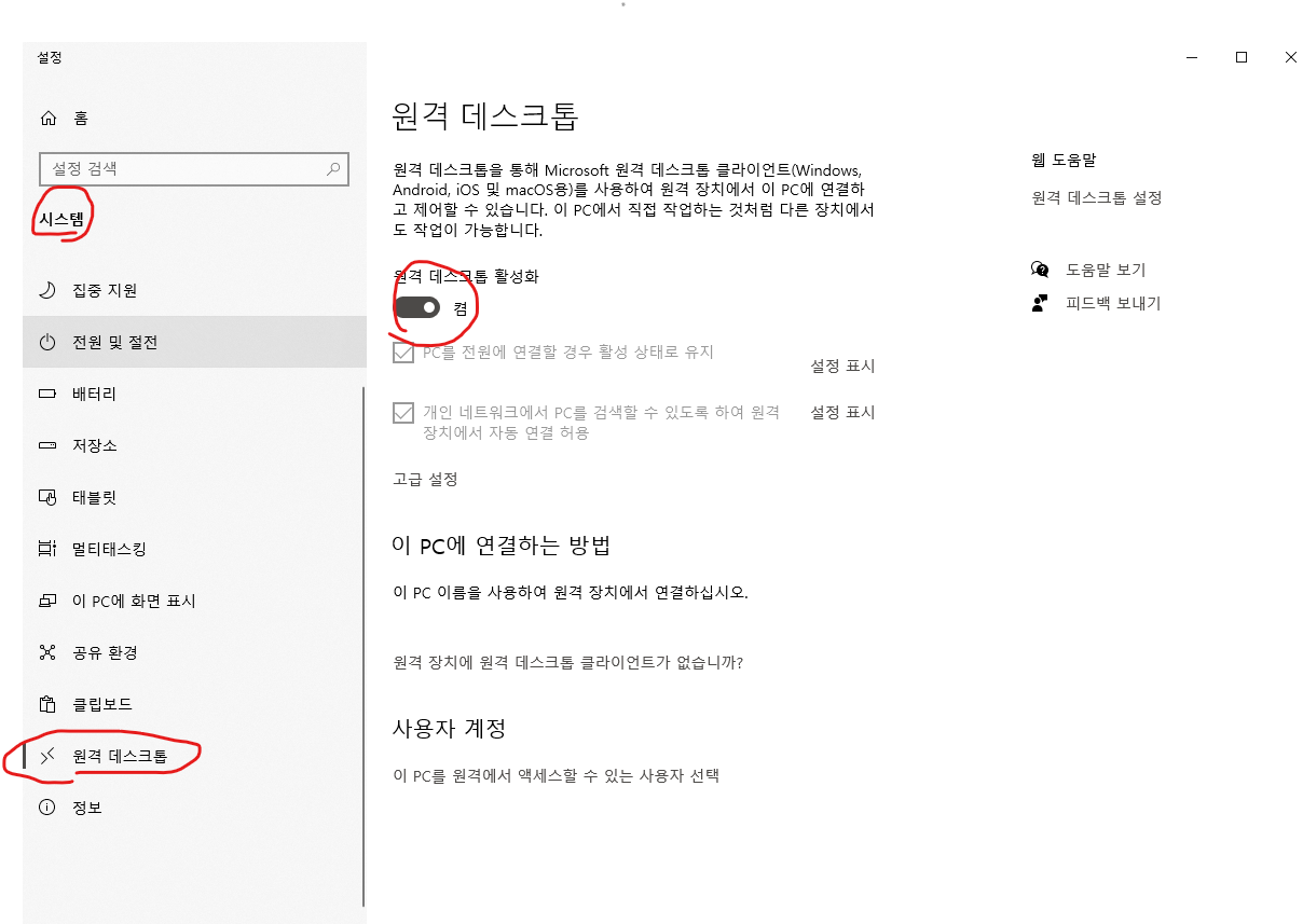 먼저 윈도우의 원격데스크탑 설정을 해주셔야 합니다.