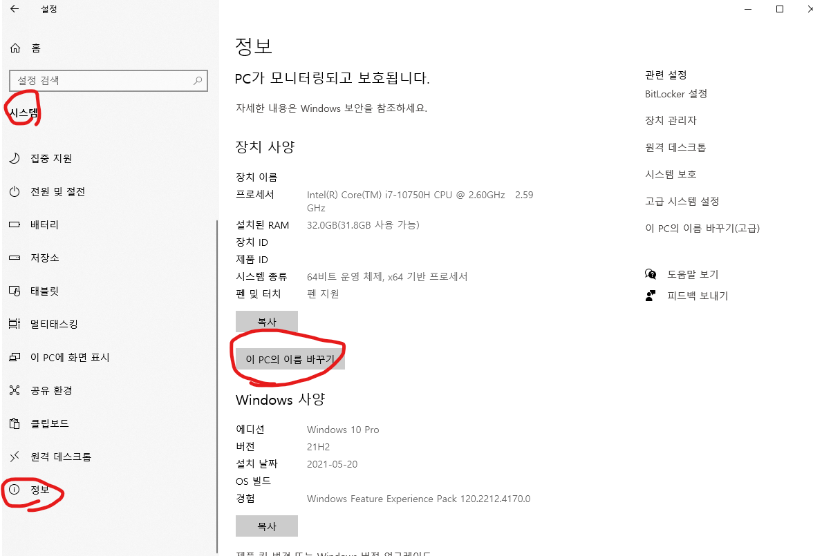 그리고 이건 하다가 안되서 했던 방법입니다. PC이름을 설정 안하셨으면 DESKTIP-~~~~ 이런식으로 나타나는데, 이렇게 했을 땐 동작이 정상적으로 되지 않았습니다.(그냥 다른 것이였을 수도 있지만요..) 그래서 바꾸는 방법도 추가로 말씀드리겠습니다. 시작 → 설정 → 시스템 → 정보에서 이 PC이름 바꾸기 클릭 하시고 변경하시면 됩니다. (참고)