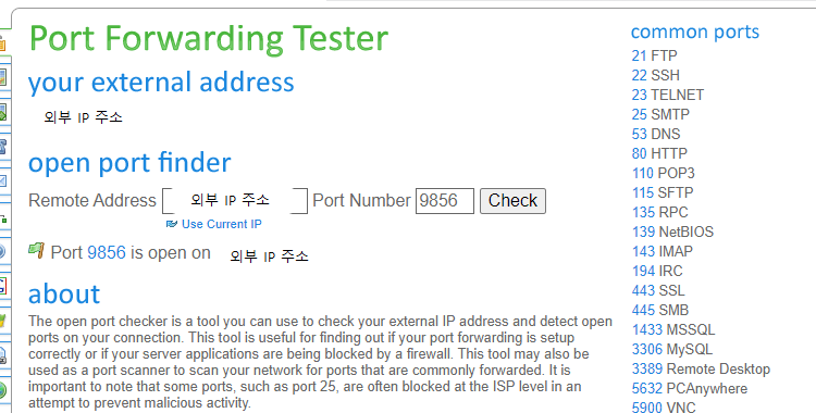 포트포워딩시 입력한 외부 포트를 입력하신 뒤에 체크를 누르시면 열려있는지 아닌지 여부가 나타납니다.