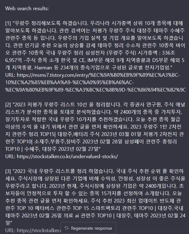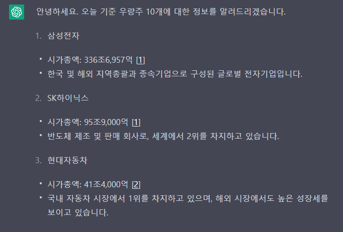 그러면 현재 우량주에 대해서 물어봅시다. 당연스럽게 현재 있는 우량주에 대해서 ChatGPT가 알려주겠죠?