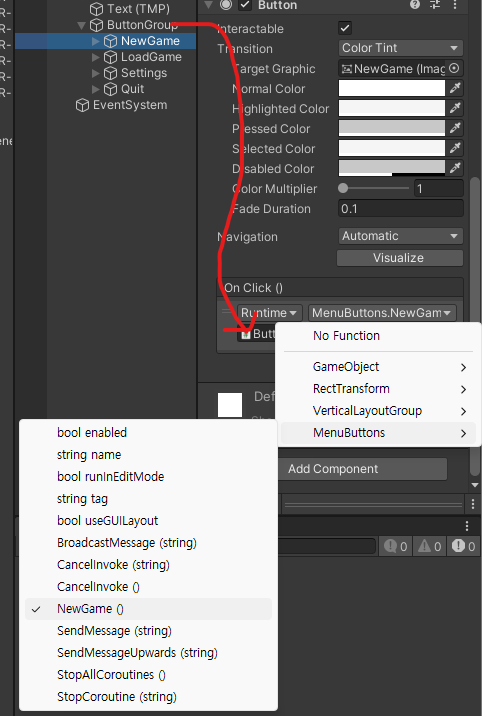 NewGame버튼을 클릭한뒤 ButtonsGroup를 드래그 하시고 작성했던 NewGame()이라는 함수를 선택하시면 됩니다.