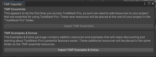 TMP를 사용했다면 아래와 같은 창을 잘 확인해주시고 Import TMP Essentials를 클릭해야 합니다.