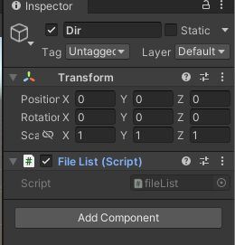 먼저 게임 오브젝트를 하나만들고 거기에 FileList라는 이름으로 컴포넌트를 추가합니다.